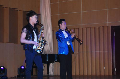 演出在鼓乐团铿锵有力的鼓声中拉开了帷幕,现场的气氛瞬间被点燃啦。阵阵鼓声博得了在场同学的热烈掌声。紧接着各种节目轮番上映,异彩纷呈。群舞《红色英雄》展现了我校舞蹈生的豪迈气概,和过硬的专业技术。一首首好听的歌曲在我们的耳边回荡,一支支美妙的舞蹈映入我们的眼帘。接着,民乐、管乐、弦乐为我们带来了一曲又一曲美妙的歌曲。把晚会推向了一个高潮,其中《动感小提琴》表演者激情的演出和《夕阳醉了》的新颖的出场赢得了大家一片又一片的呐喊声。英文歌曲《Rolling in the deep》时尚而动感的旋律将晚会推向了第二个高潮,在别致的曲风中,现场再次沸腾起来。最后在稚嫩的童声中一曲《明天会更好》将晚会推向了最高潮,一位特邀嘉宾与师大的学生共同唱响了这首《明天会更好》,表现了对明天的憧憬和对未来的美好向往。