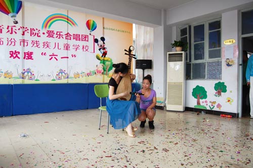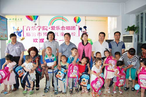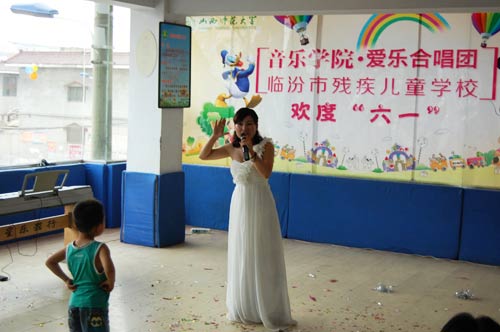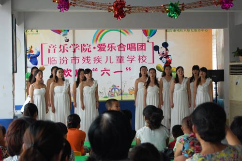 为了贯彻落实省高校工委、校党委《关于开展"学习焦裕禄,争做好公仆"活动的通知》,我院党委积极开展“学习焦裕禄,争做好公仆”“六个一"系列活动。在"六·一"儿童节来临之际,beat365官方网站党员干部带领爱乐合唱团部分成员于2014年5月31日前往临汾市残疾儿童学校,专程为学校的孩子们送去了精彩的文艺节目和文具用品,与残疾学校的孩子们共同度过了快乐的儿童节。