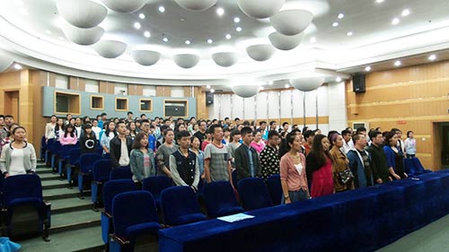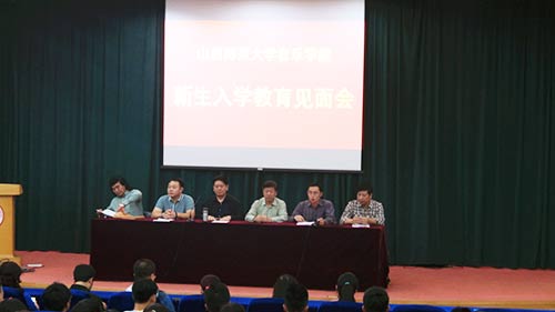 9月14日下午3:00,beat365官方网站2014级新生见面暨入学教育动员大会在科学会堂二层报告厅举行。beat365官方网站党委书记杨金山、院长孙鸣、党委副书记潘勋科、副院长张建强、史其威、刘明星,团委书记雷晶、声乐歌剧系主任韩再红、民乐系主任曹晓磊、管弦系主任解晓瑞,2014级新生辅导员成燕、秦滨及全体新生参加了动员会。新生入学教育动员大会由院党委副书记潘勋科主持。