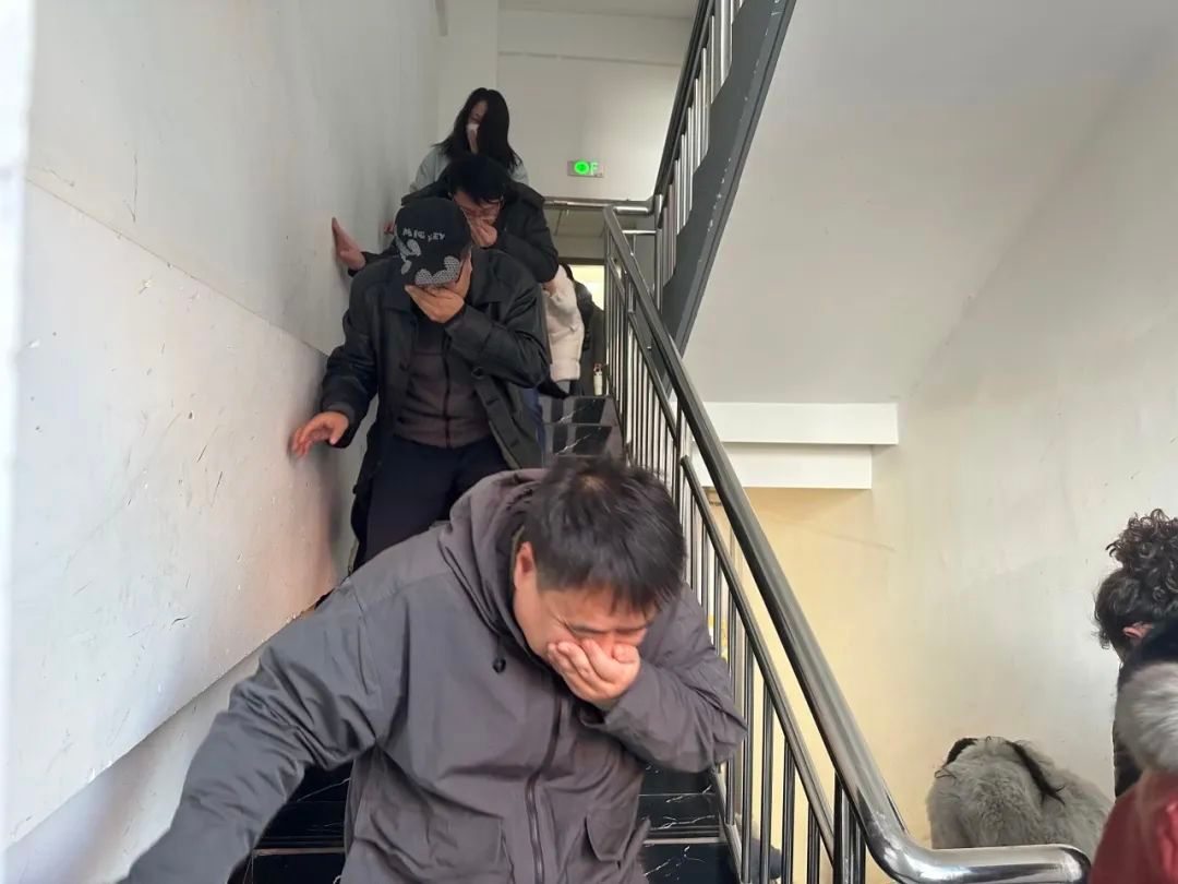 在逃生演练中,伴随着警报声,老师们迅速按照预定的逃生路线有序撤离,大家弯腰低姿、捂住口鼻,模拟真实火灾场景下的逃生状态。整个逃生过程紧张有序,充分展现了老师们在紧急情况下良好的应急反应能力和团队协作精神。
