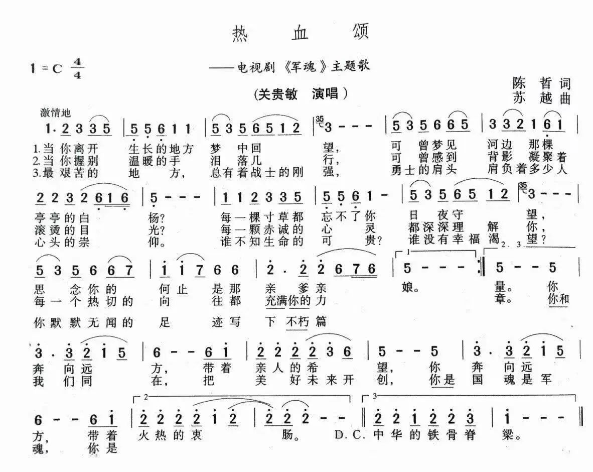 《热血颂》是一首革命英雄主义的颂歌,创作于上世纪的1986年,陈哲作词,苏越作曲,由著名歌唱家郁钧剑演唱。歌曲表现的是在20世纪70年代末那场边境自卫战争中,保家卫国的人民子弟兵为了国家的利益而视死如归,凭着对祖国对人民的无限忠诚,驰骋疆场去舍身报国,用生命和热血保卫伟大祖国的可贵精神。歌曲的旋律深情舒展,歌词朴实生动,是一首让人听后热血奔涌、百感交集、抑制不住热泪的经典军旅歌曲。