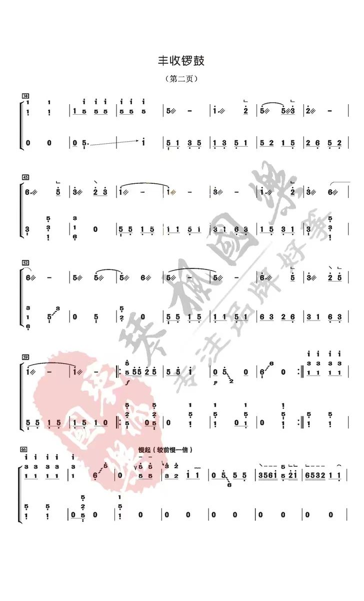 《丰收锣鼓》是一首山东风格的筝曲,不仅仅是因为曲作者是山东海阳人,而是乐曲的素材来源于柳琴戏音调。此曲是著名筝家李祖基先生最有名的作品,乐曲以传统山东柳琴戏音调为素材创作而成,具有浓郁的山东民间音乐风格。乐曲以左手有规律的、模仿锣鼓音型的伴奏和优美的旋律,表现了人们在丰收的季节里,敲锣打鼓,喜庆丰收的欢乐情景。筝曲总共分三段。第一段热烈奔放,左手的伴奏犹如锣鼓一样,节奏感强烈;第二段音乐是抒情的慢板,旋律优美如歌,尤其是食指的连抹、大指的连托所产生的效果,使音乐平添几分色彩,凸显出山东筝派的某些演奏特色(是连抹,而不能作为花奏处理);第三段则是对第一段音乐压缩后的再现,比第一段节奏更加快速,也更加激烈。乐曲在饱满的和音中结束。