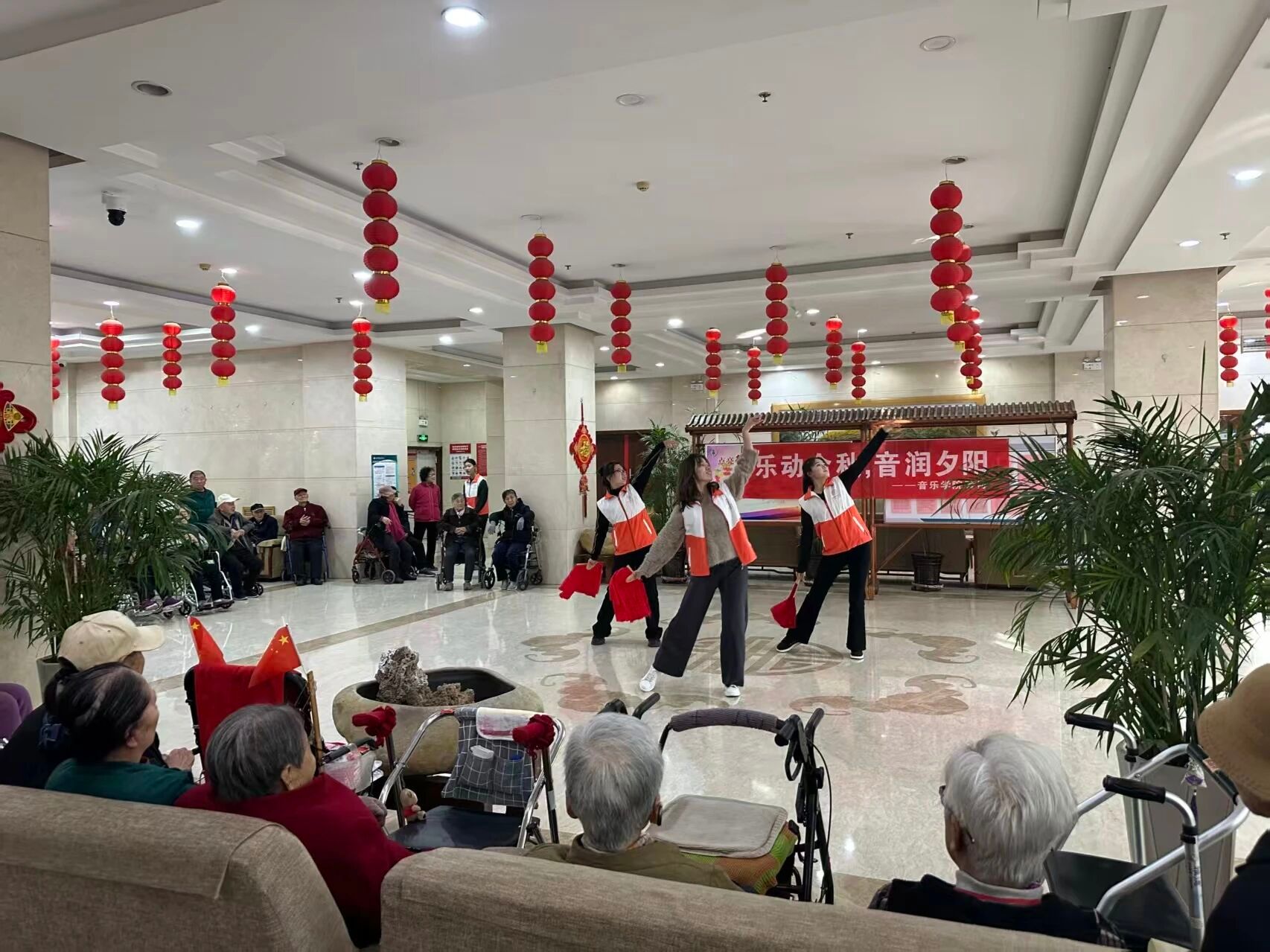 除精彩文艺汇演外,活动还设丰富互动环节。学子们耐心教老人学简单舞蹈动作,陪他们合唱经典曲目。当老人们在音乐生伴奏下,与舞蹈生共同完成简单表演,现场温情四溢。老人们或轻声跟唱,或随节奏轻摆身体,原本陌生的距离在音乐与交流中悄然消融,青春与暮年的对话格外动人,尽显传承美德与青春担当。