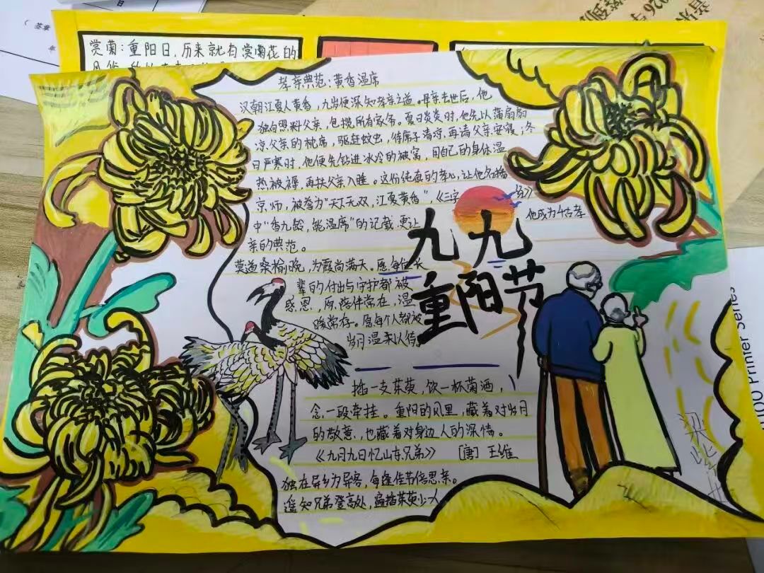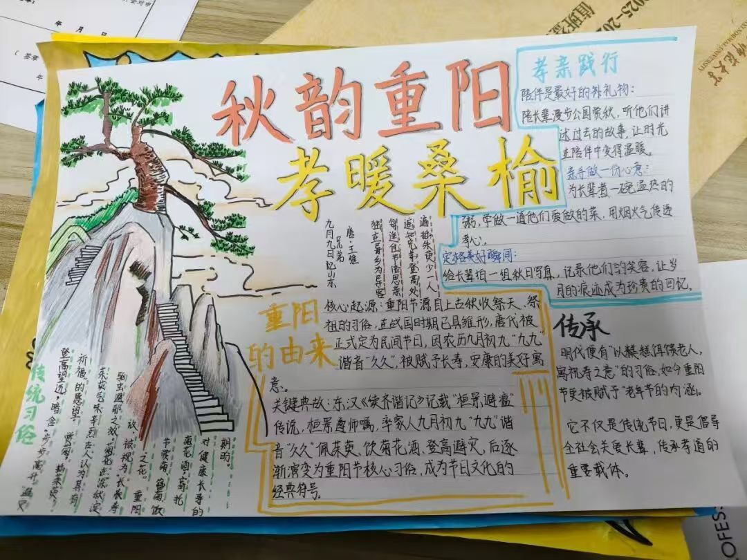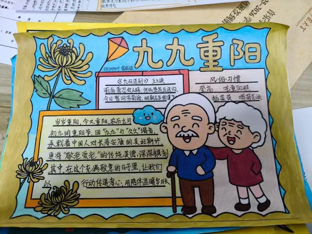 此次活动,同学们以“孝暖桑榆”为核心设计版面,在作品中融入“青春向长辈致敬”的手写感悟,让参与者在创作中感受重阳“赏菊、敬老”的文化内涵,唤醒对长辈的感恩心,既传承中华传统美德,又营造“老吾老以及人之老”的暖氛围,实现文化传承与情感教育的双重价值。