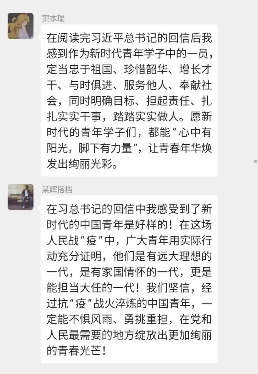 薛晴河:看过习近平总书记给北京大学援鄂医疗队全体“90后”党员的回信后我感触颇深。习近平总书记说“青年一代有理想、有本领、有担当,国家就有前途、民族就有希望。”90后青年党员在与疫情的防控斗争中坚持一线,不惧艰险,无私奉献,使我国疫情快速有效的得到了控制。他们彰显了新时代青年勇于担当、敢于拼搏的青春的力量。而我们现在能做的就是励志勤学,努力学好专业文化技能,在将来为祖国的发展做出自己的贡献!