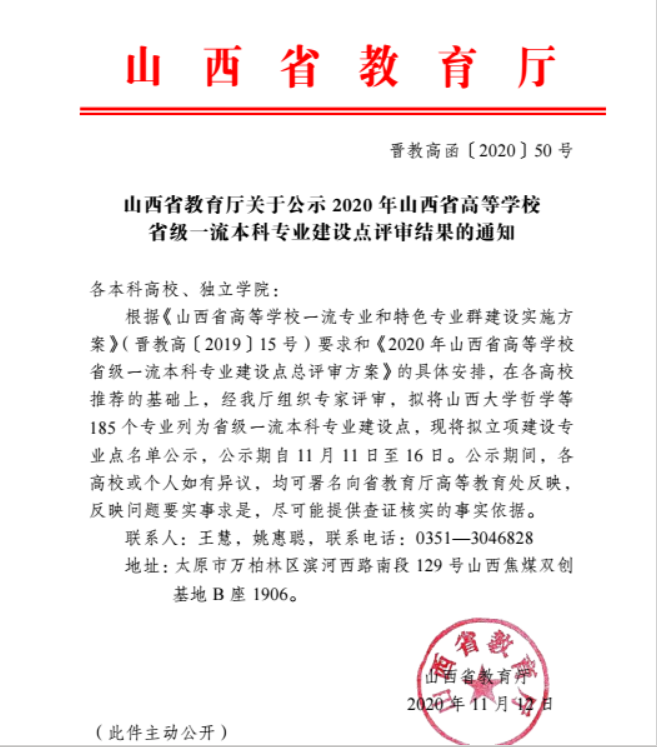 11月12日,山西省教育厅下发《山西省教育厅关于公示 2020 年山西省高等学校省级一流本科专业建设点评审结果的通知》。beat365官方网站beat365官方网站音乐学专业入选“山西省高等学校省级一流本科专业建设点”。