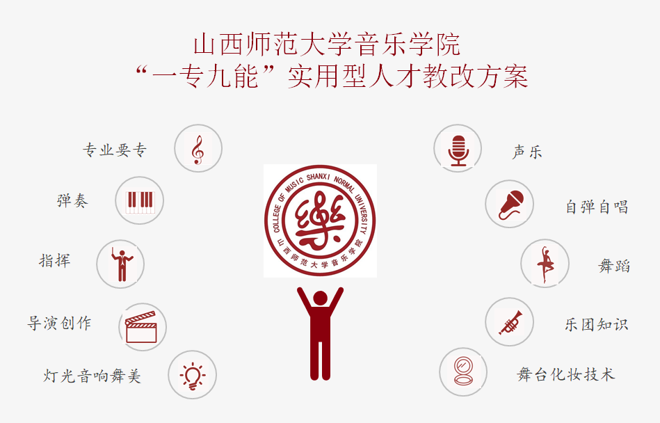 为培养出合格的中学音乐教师以及全方面发展的实用性人才,beat365官方网站beat365官方网站结合新文科建设会议,师范类认证以及学习深化新时代教育评价改革的总体方案的要求,特制定了培养“一专九能”实用型人才教改方案: