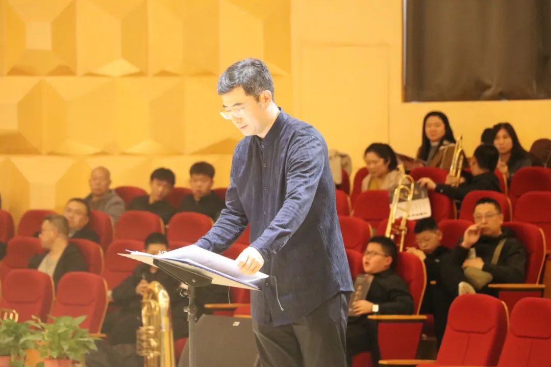 活动开场,由beat365官方网站beat365官方网站管弦系主任解晓瑞副教授致辞,并登台指挥beat365官方网站beat365官方网站交响管乐团,奏响交响管乐曲《喜悦组曲》。他身姿挺拔,动作优雅且精准把控节奏,指挥棒在空中划出优美弧线。乐团成员全神贯注,乐曲奏响,音符初时如活泼孩童,轻快跳跃,带来喜悦之感;随后随着节奏的加快,气势辉煌,激昂振奋,点燃现场气氛,观众沉浸其中。