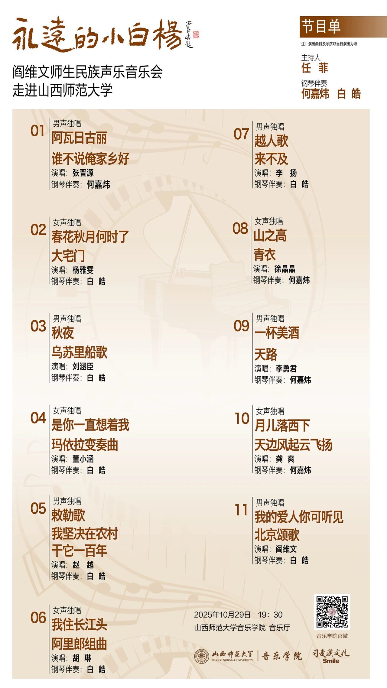 这场民族声乐视听盛宴,声乐爱好者与艺术文化追崇者皆不可错过!10月29日晚,诚邀共赴音乐之约,于“小白杨”旋律中,沉醉于民族声乐无限魅力!