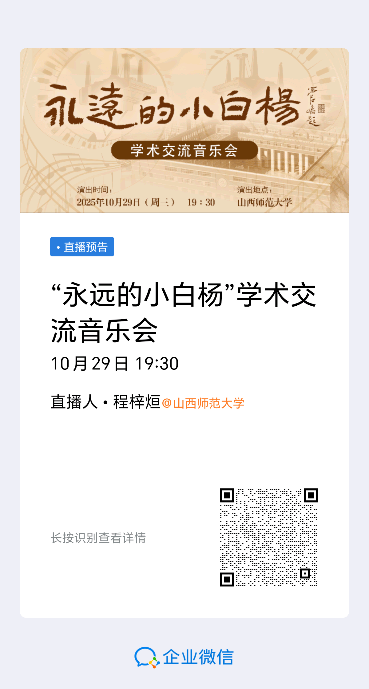 - 校内师生可通过企业微信直播观看:程梓烜@beat365官方网站,长按识别海报二维码即可进入